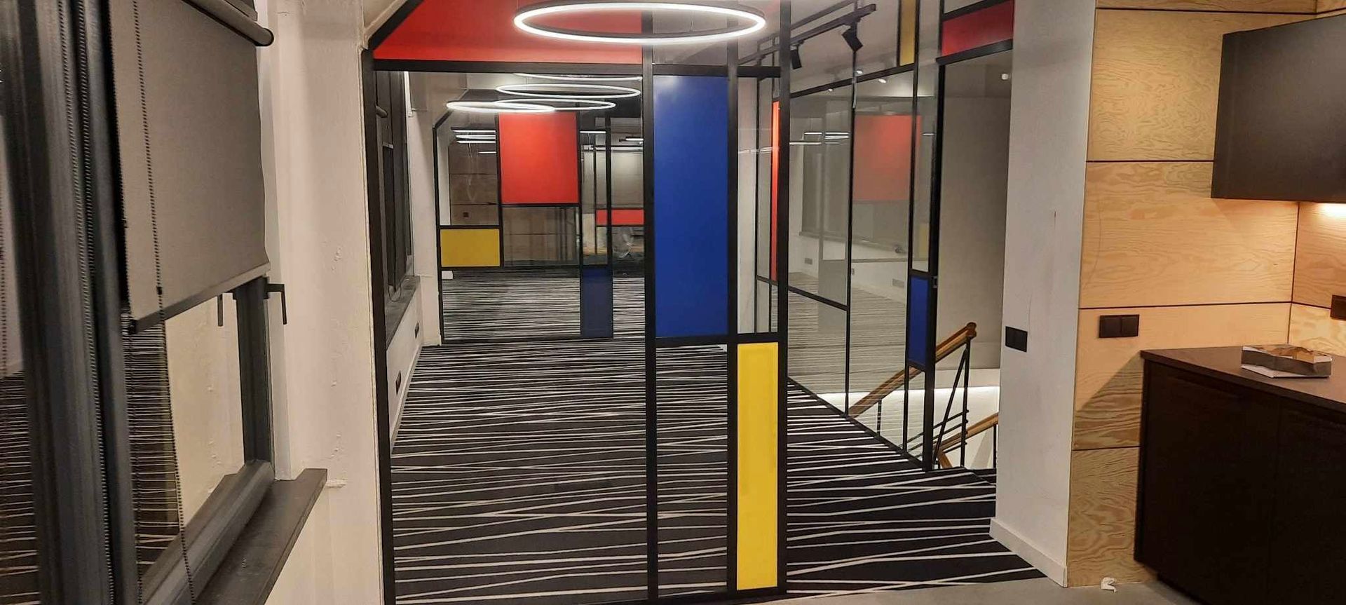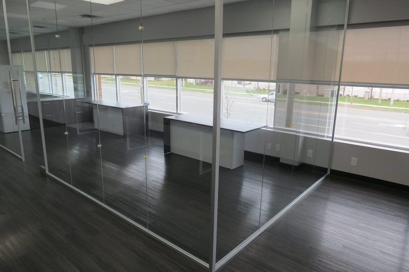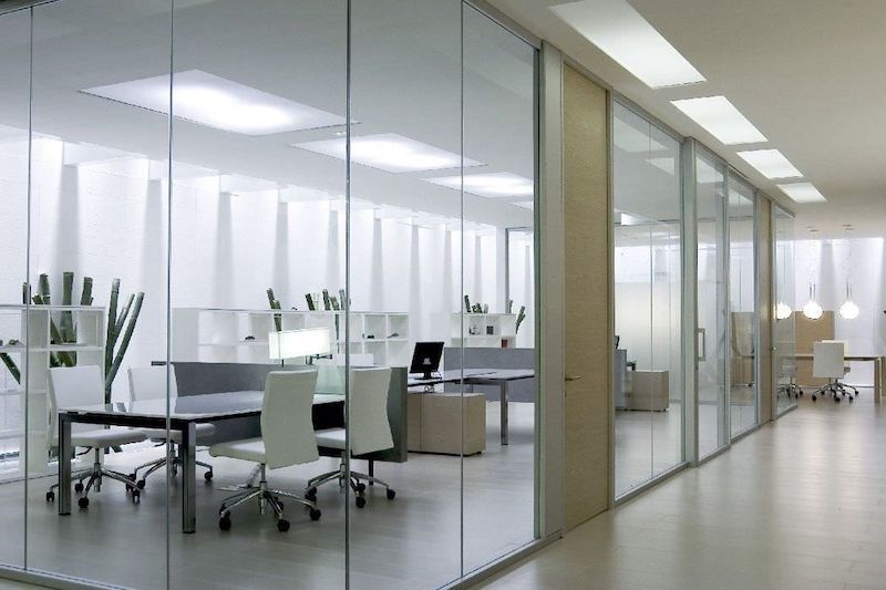 Stiklo konstrukcijų panaudojimas jau ne vienerius metus dominuoja ir įrenginėjant biurų interjerą. Tai ypač aktualu didelėse patalpose, kai vienoje patalpoje dirba daug žmonių. Dėl patogumo ir praktiškumo stiklinės pertvaros tokiais atvejais yra geriausiai tinkantis sprendimas. Stiklinės pertvaros biuruose leidžia sukurti darbui palankią aplinką nesumažinant erdvės. Tuo tarpu skirtingos paskirties zonų atskyrimas išsaugo bendrą erdvės įspūdį.
